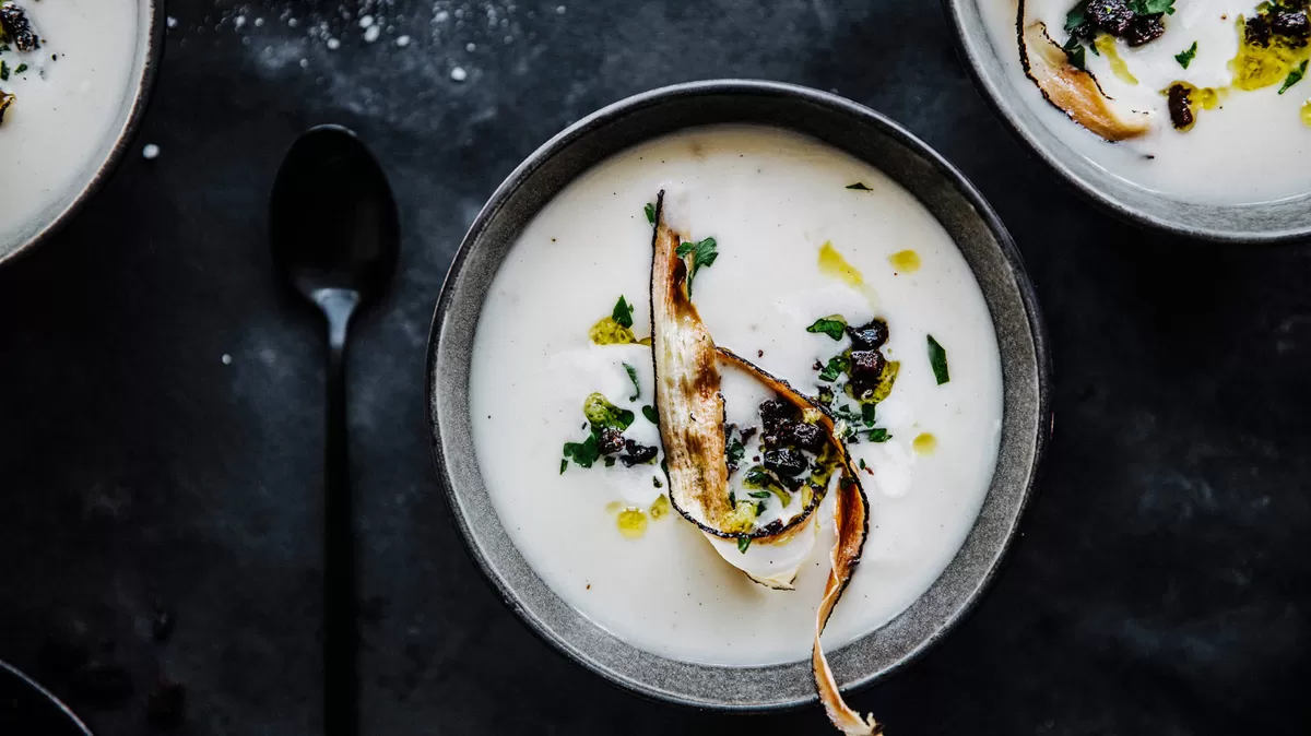 Tálaláskor a leves tetejére teszek egy adagot a kenyérkockákból, arra néhány sült feketegyökér-szalagot, és meghintem pár csepp citromolajjal.