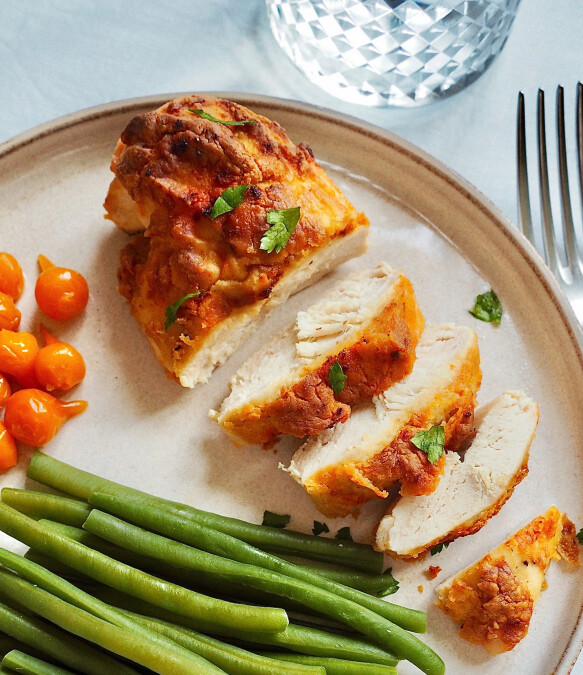 Röviden csak annyi a lényege, hogy a sóval, borssal ízesített csirkemelleket 1-1 kanál humusszal bekenem, pirospaprikával meghintem, és egy olajjal kikent hőálló tálban 230 fokra előmelegített sütőben kb 20 perc alatt megsütöm. Kívül pirult, belül omlós lesz.